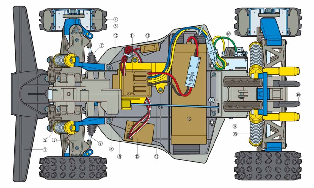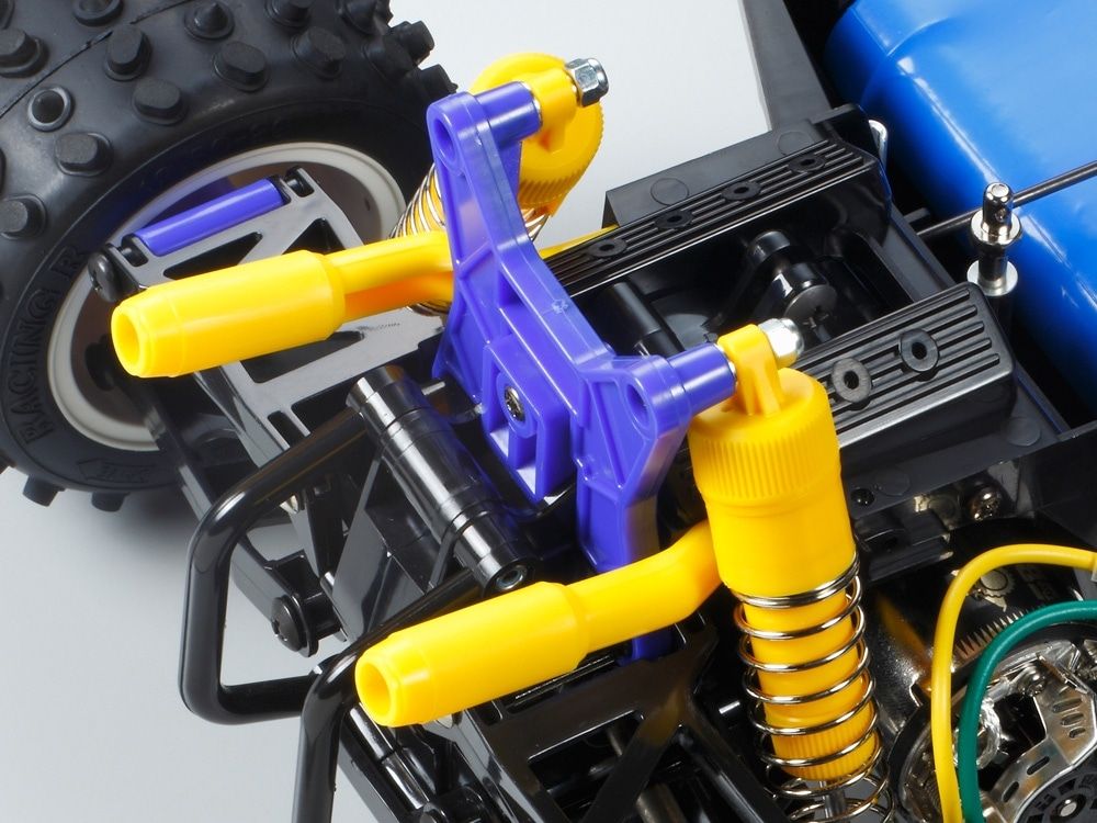 The extremely stable shaft-driven 4WD drive train has excellent efficiency thanks to full ball bearings, while differential gears ensure cornering is smooth. 4-wheel independent double wishbone suspension employs A-shaped front and H-shaped rear arms for excellent durability, with CVA oil dampers for high-quality suspension stroke. Dish wheels are not just aesthetically pleasing, but also practical on the off-road surfaces the Bigwig (2017) calls home; they are paired with grippy oval bock tires. The rack and pinion steering setup remain unique to the Bigwig among Tamiya R/C cars.