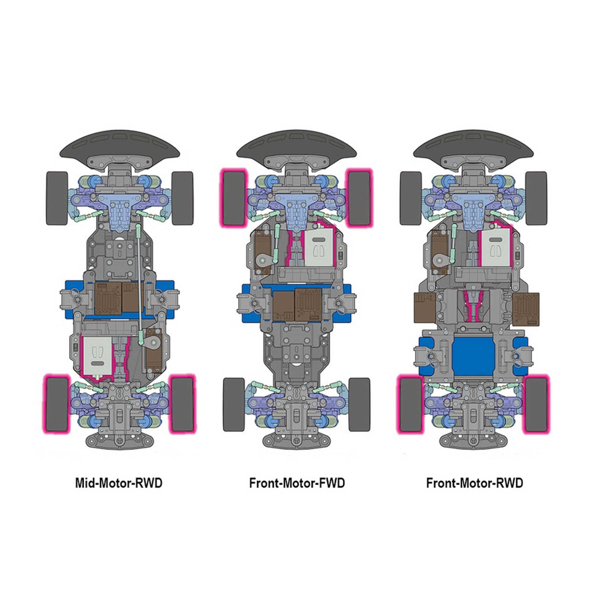 - Without removing battery pack, motor, and R/C equipment setups from the center frame, simply change attachment directions of final gears and steering linkage to switch between front and rear wheel drive.
