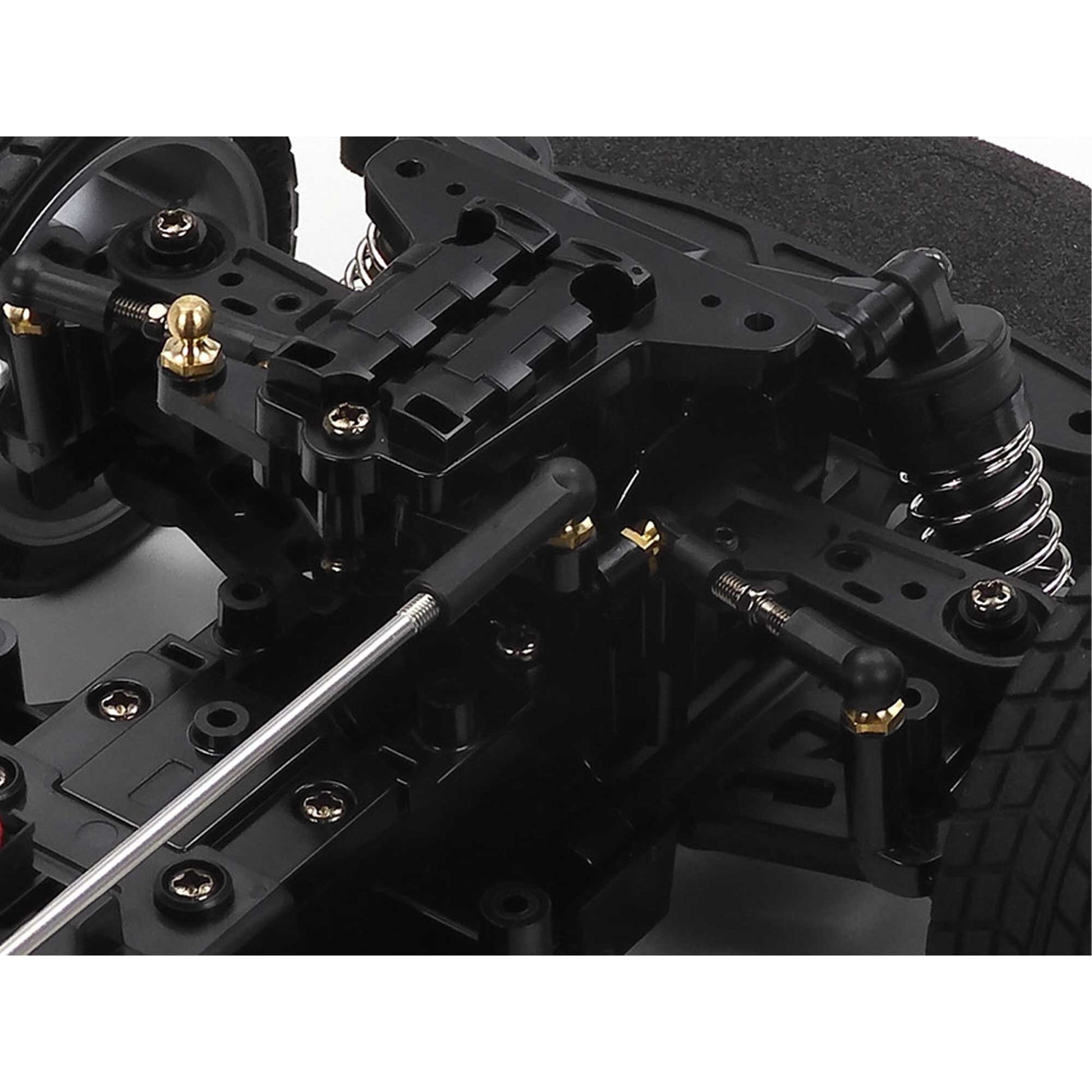 The 2WD BT-01 chassis gives the choice of two types of wheelbases, and front-or rear-wheel drive system. Without removing the battery pack, motor, and R/C equipment setups from the center frame, simply change attachment directions of final gears and steering linkage to switch between front-and rear-wheel drive; front (FR) or midship rear (MR) motor position can be chosen for rear-wheel drive cars. The 4-wheel double wishbone suspension features symmetrical structure and friction dampers. Unitized sections such as the motor mount, final gears and suspension facilitate ese of assembly and effective maintenance.