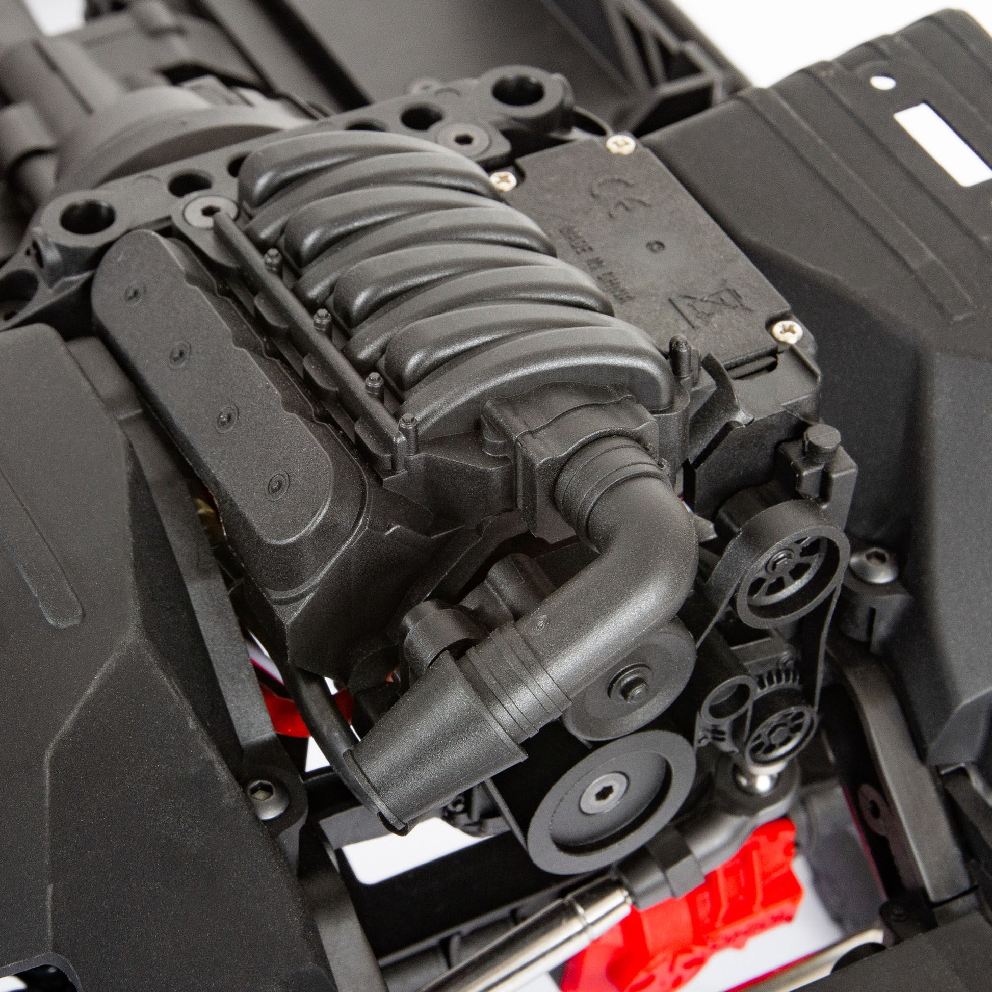 The V8 engine cover protects the 540-size motor and is mated to a scale transmission housing. In addition to offering motor protection and realistic looks, the design gives the chassis forward-mounted weight.