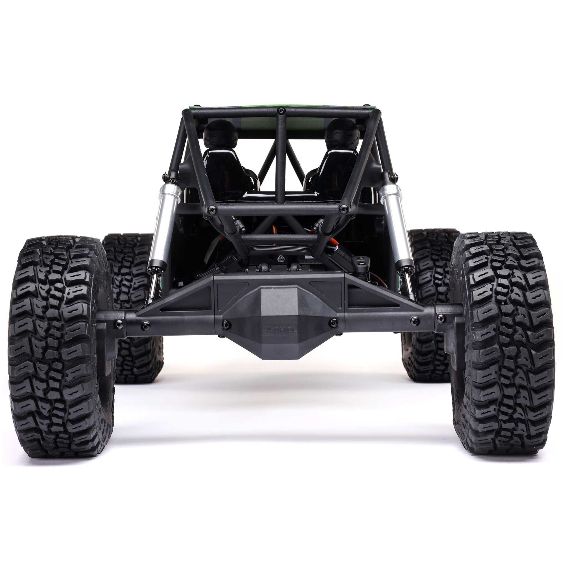 Further improving the rig’s trail performance are the extreme articulation of its 4-link suspension and the additional clearance of its realistic, new IS10 internal spring shocks. An oversized, high torque Axial Boulder 550 21-turn brushed motor sends power through durable, heavy-duty WB12 driveshafts to officially licensed Raceline Avenger wheels and 5.5-inch tall Mickey Thompson Baja Boss M/T tires. Surrounding it all is a durable composite cage that offers protection and challenge-ready trail buggy looks.