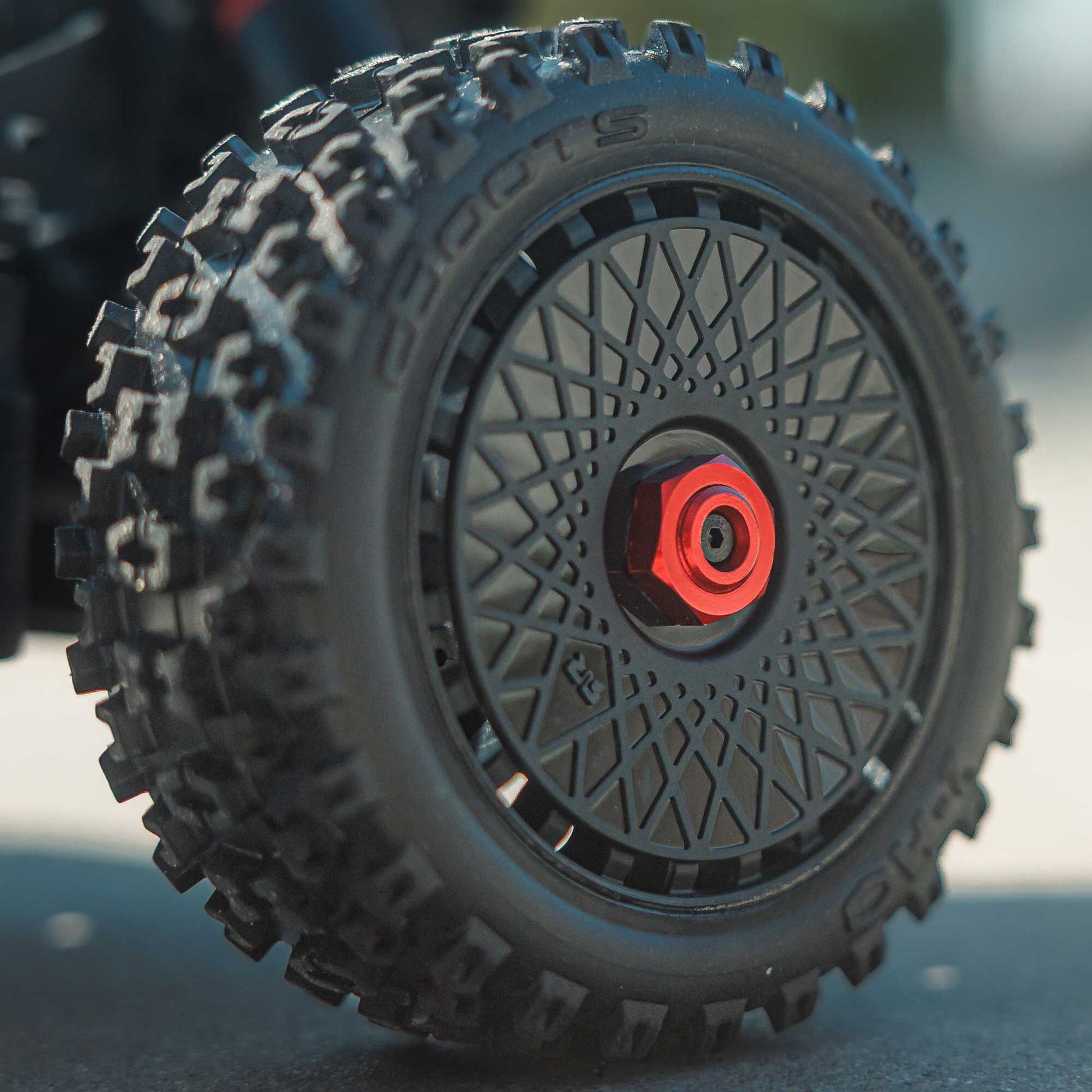 The multi-surface dBoots 2-HO tread pattern tires provide awesome traction in all conditions. Vent holes allow air to move in and out of the tire to improve traction and let water and dirt escape. The tires are mounted on tough nylon multi-spoke pattern wheels with foam inserts to improve grip and handling.