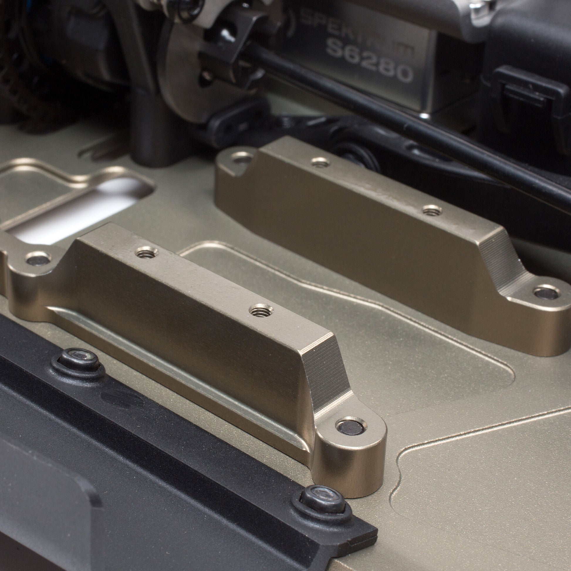 Chassis width has been increased to aid in stability and give the truggy a more neutral feel as well as equalized side to side for equal torsional flex and thinned down to 3mm for weight savings.