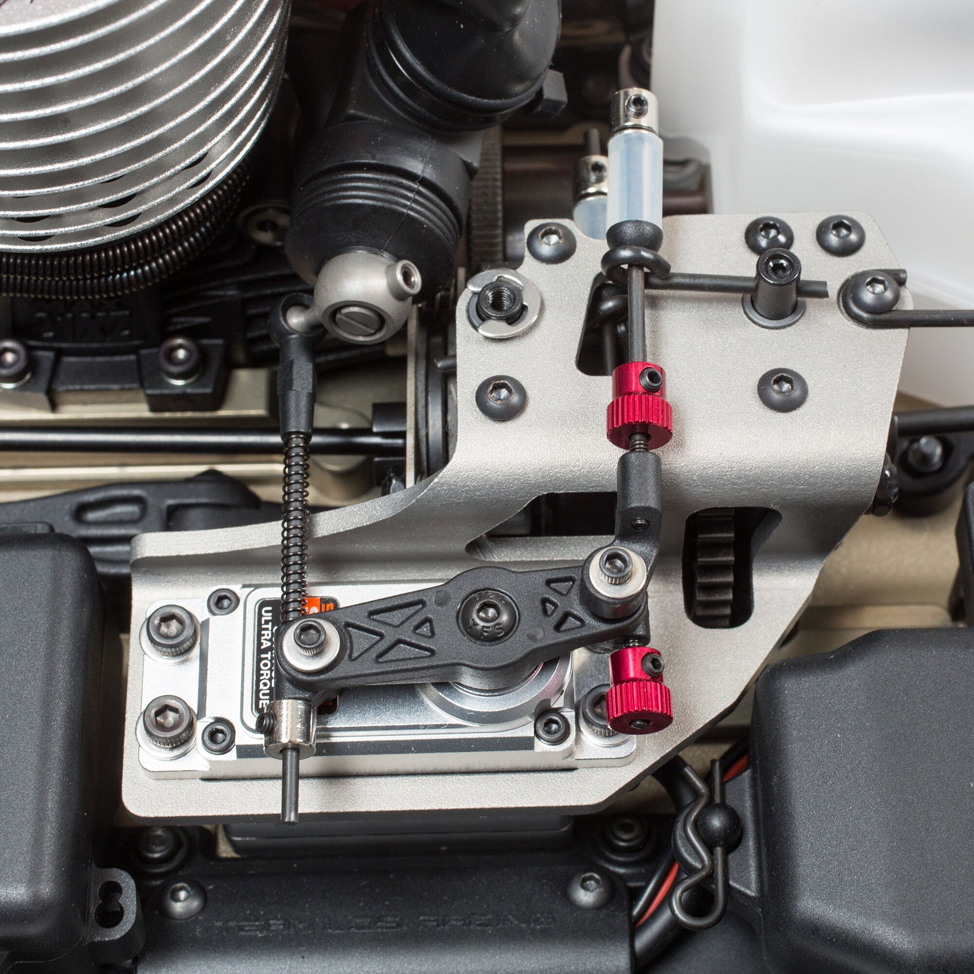 An updated radio tray now puts the throttle servo near the engine to eliminate additional linkage. The updated radio tray will ensure the throttle servo is rigidly mounted to avoid any flex by floating the servo off of the center differential.