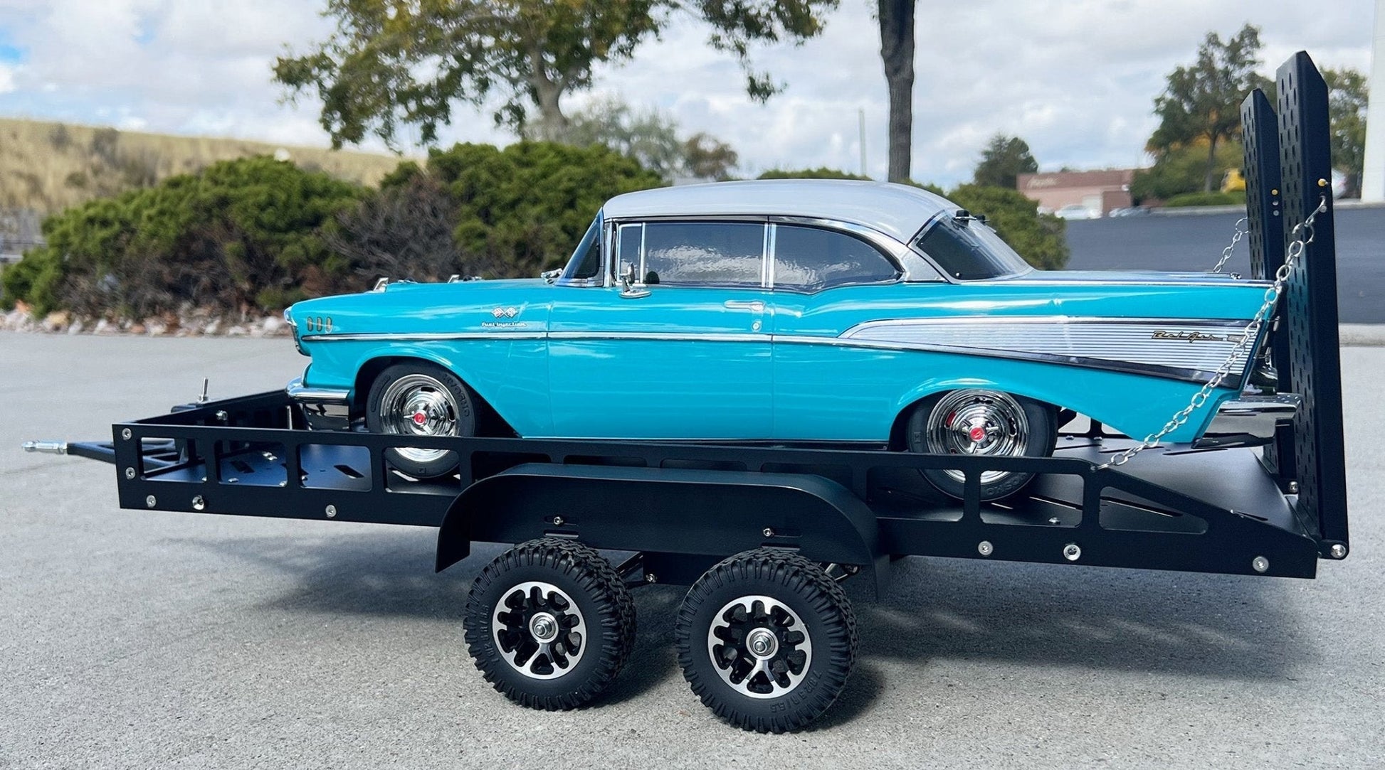This trailer is built to 1/10 scale with utmost attention to detail. Every component, from the chassis to the wheels, is made from high-quality, durable metal, ensuring longevity and durability. The sleek Black finish on this trailer looks impressive and helps protect against scratches and wear. Equipped with bright LED lights, this trailer brings your RC adventures to life by providing illumination for both daytime and nighttime adventures, adding a touch of authenticity to your setup. The trailer is not just about looks. Designed for use, the trailer bed is spacious making it ideal for transporting miniature payloads or showcasing your favorite 1/10 scale vehicles. Attaching the trailer to your RC vehicle is a breeze, thanks to the user-friendly hitch mechanism. It securely locks in place, ensuring that your trailer stays attached while you navigate challenging terrain and obstacles.